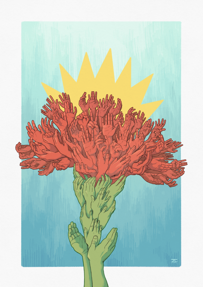 Ilustração de mãos verdes formando o caule e mãos vermelhas formando flores com fundo azul e sol amarelo
