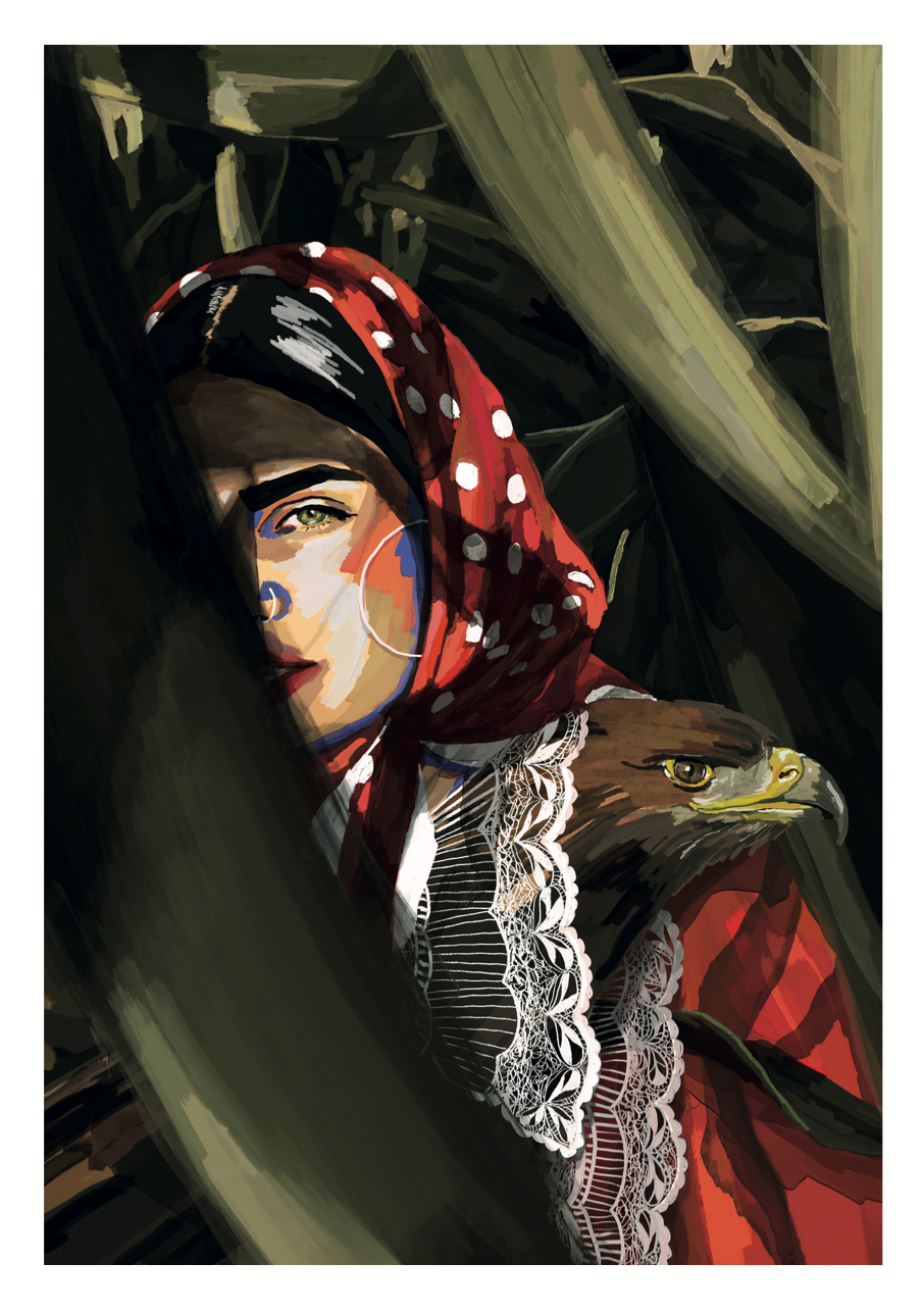 • Mulher com lenço vermelho e bolinhas brancas, maquiagem colorida, roupa com renda branca e águia ao lado entre troncos de árvore.