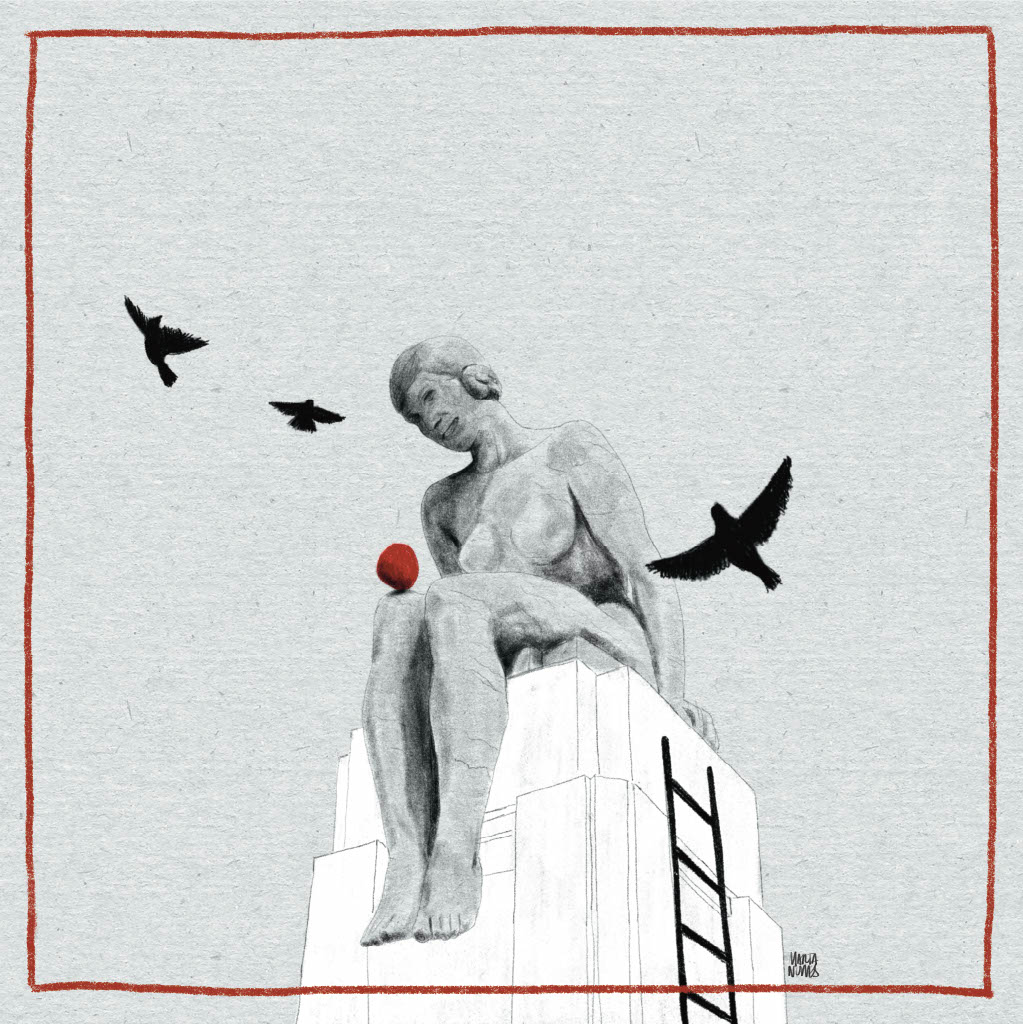 • Escultura de mulher sentada com ovo vermelho no joelho, pássaros pretos e pedestal branco com escada.