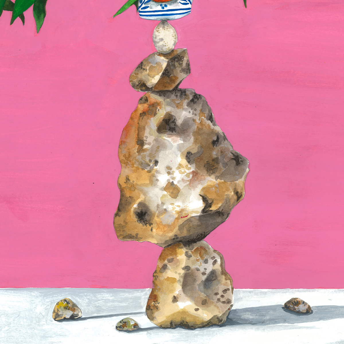 • Cinco pedras empilhadas com fundo rosa e folhas verdes