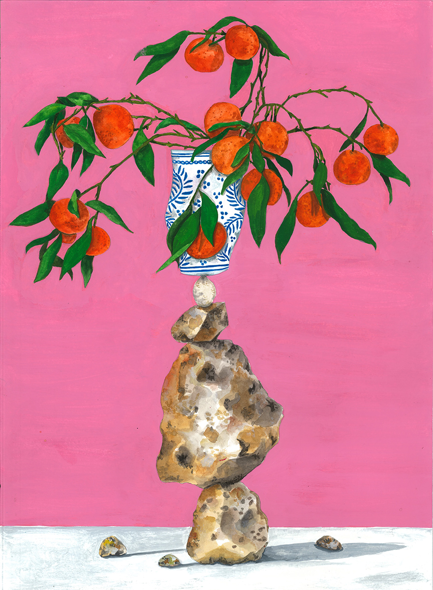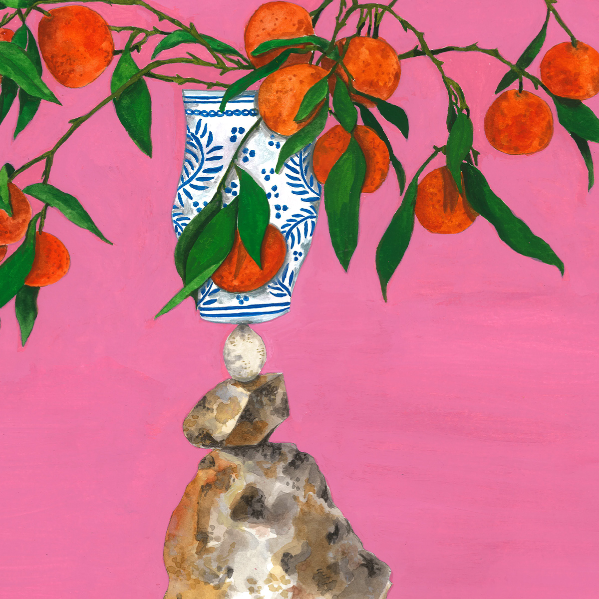 • Arranjo de galhos com laranjas e folhas num vaso cerâmico branco com padrão azul sobre pedras empilhadas, fundo rosa.