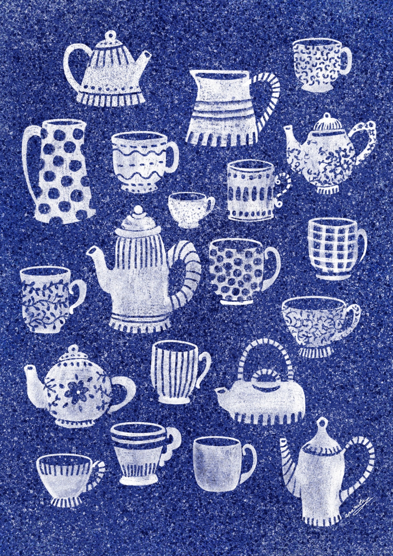 • Ilustração de bules e chávenas brancas com padrões diversos sobre fundo azul