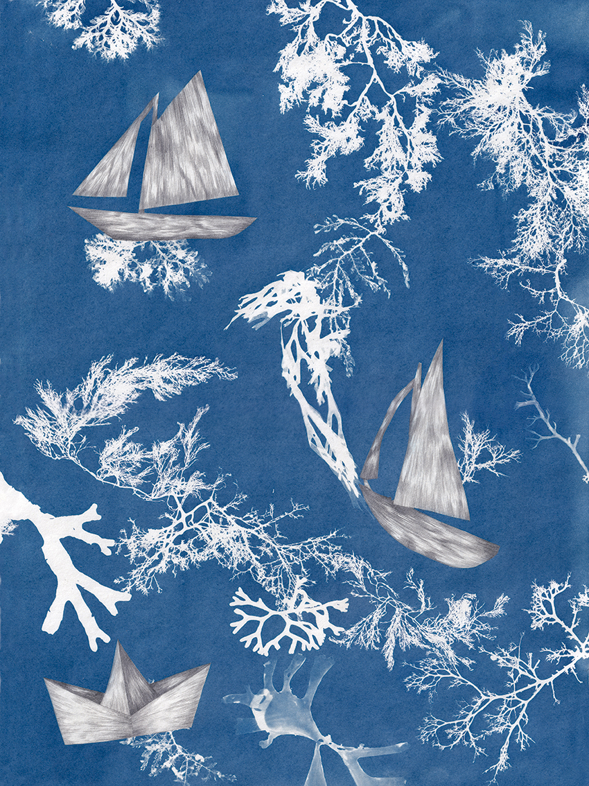Azul, parte de um conjunto de desenhos sobre água, mar, verão, vento e sombra. A cianotipia é uma técnica alternativa e ecológica, impressa por elementos naturais – o sol e a água. São resultado de uma pesquisa local, que retrata a flora marítima e veraneia. impressa ao ritmo das ondas. Os desenhos aliam-se aos fotogramas e exploram relações entre as sombras desenhadas e fotografadas. Vamos molhar os pés?