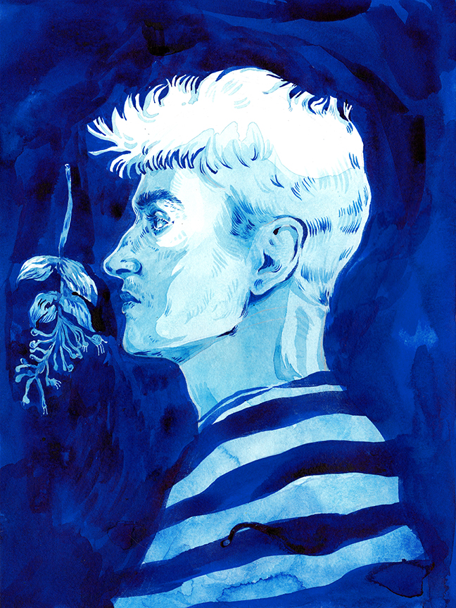 • Pintura azul de perfil de homem com cabelo branco e camisa às riscas