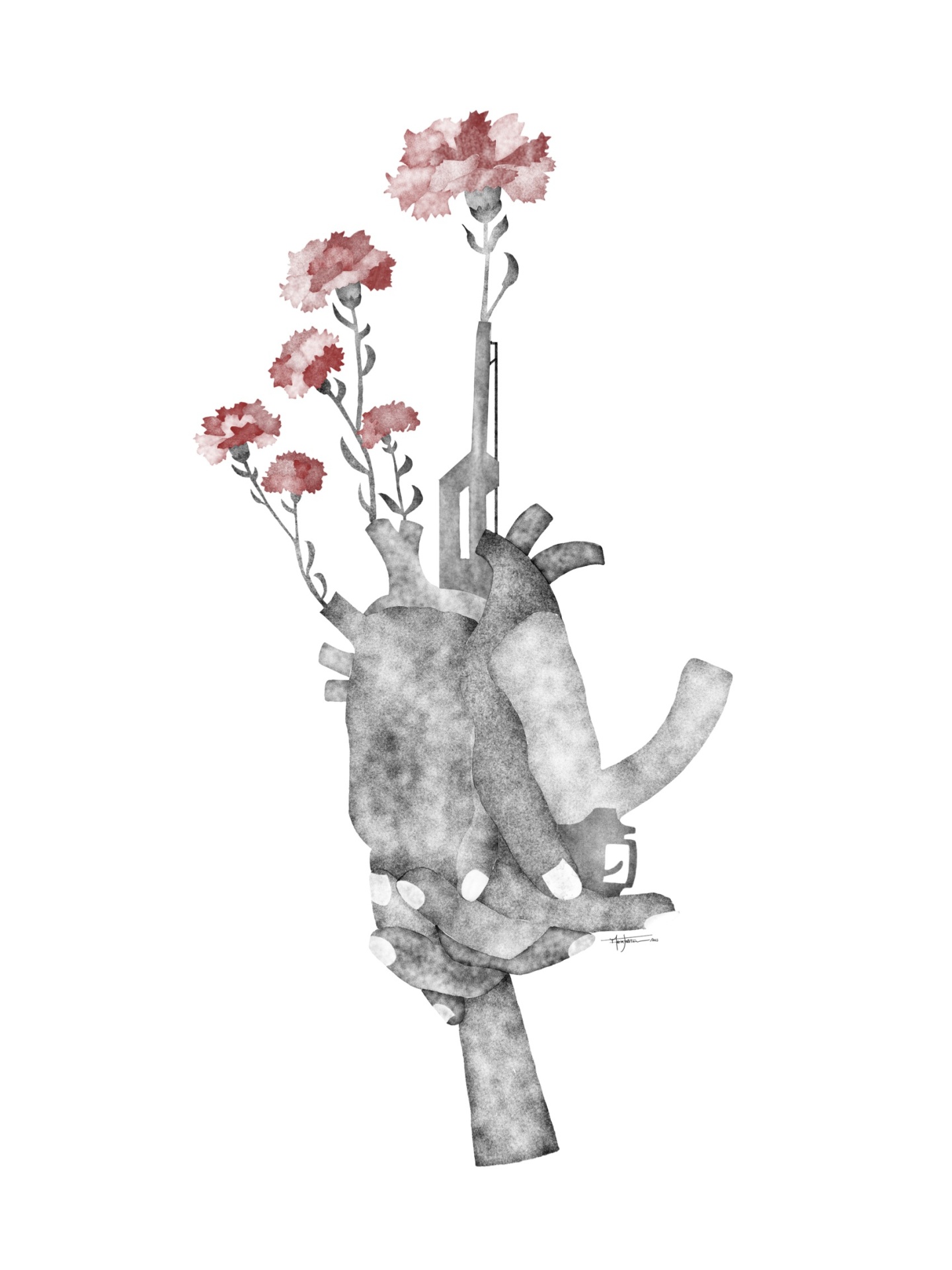 • Ilustração em preto e branco de coração anatómico com rosas vermelhas a crescer.