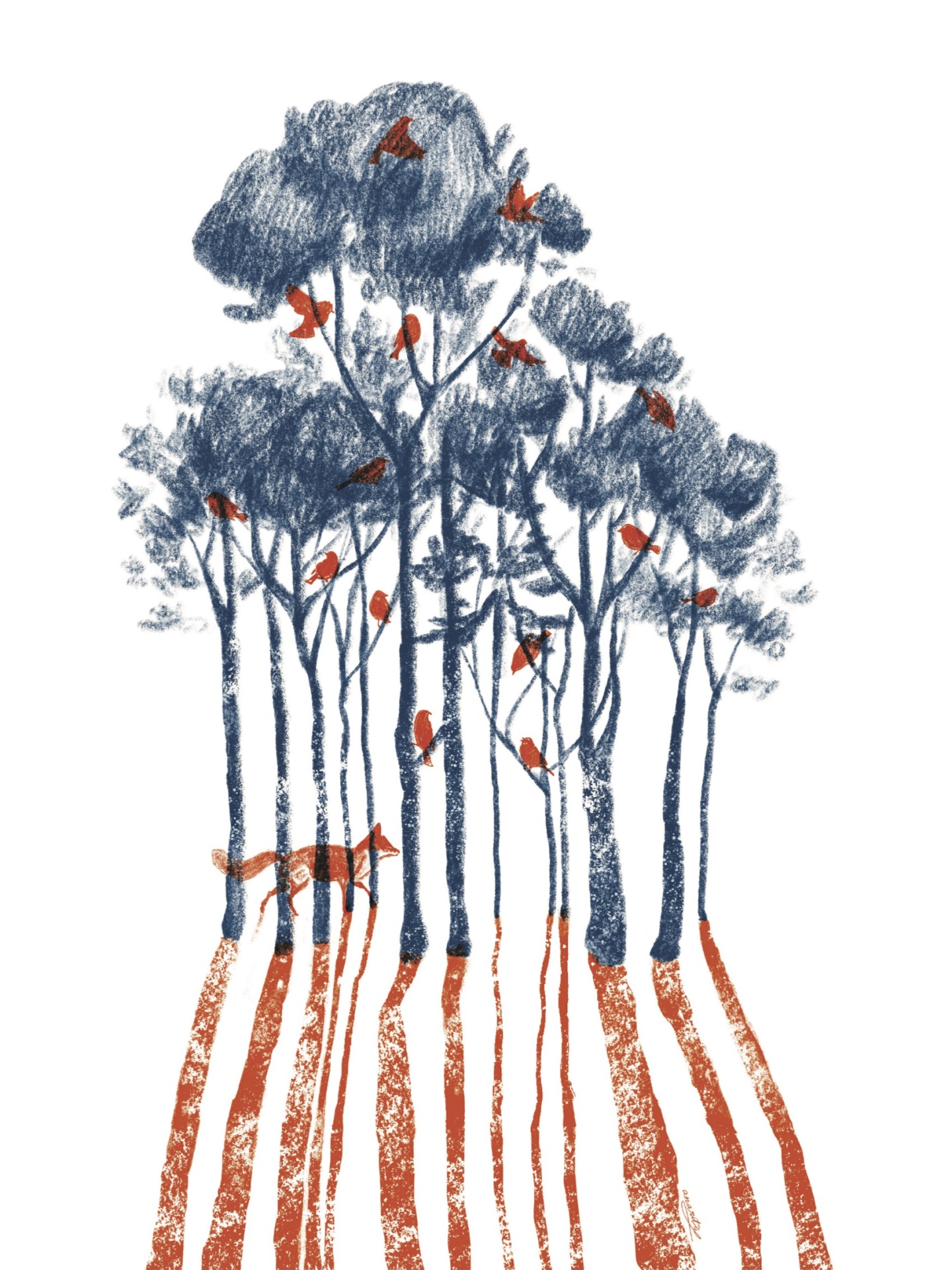 • Ilustração artística de floresta com árvores azuis, pássaros e raposa laranja.