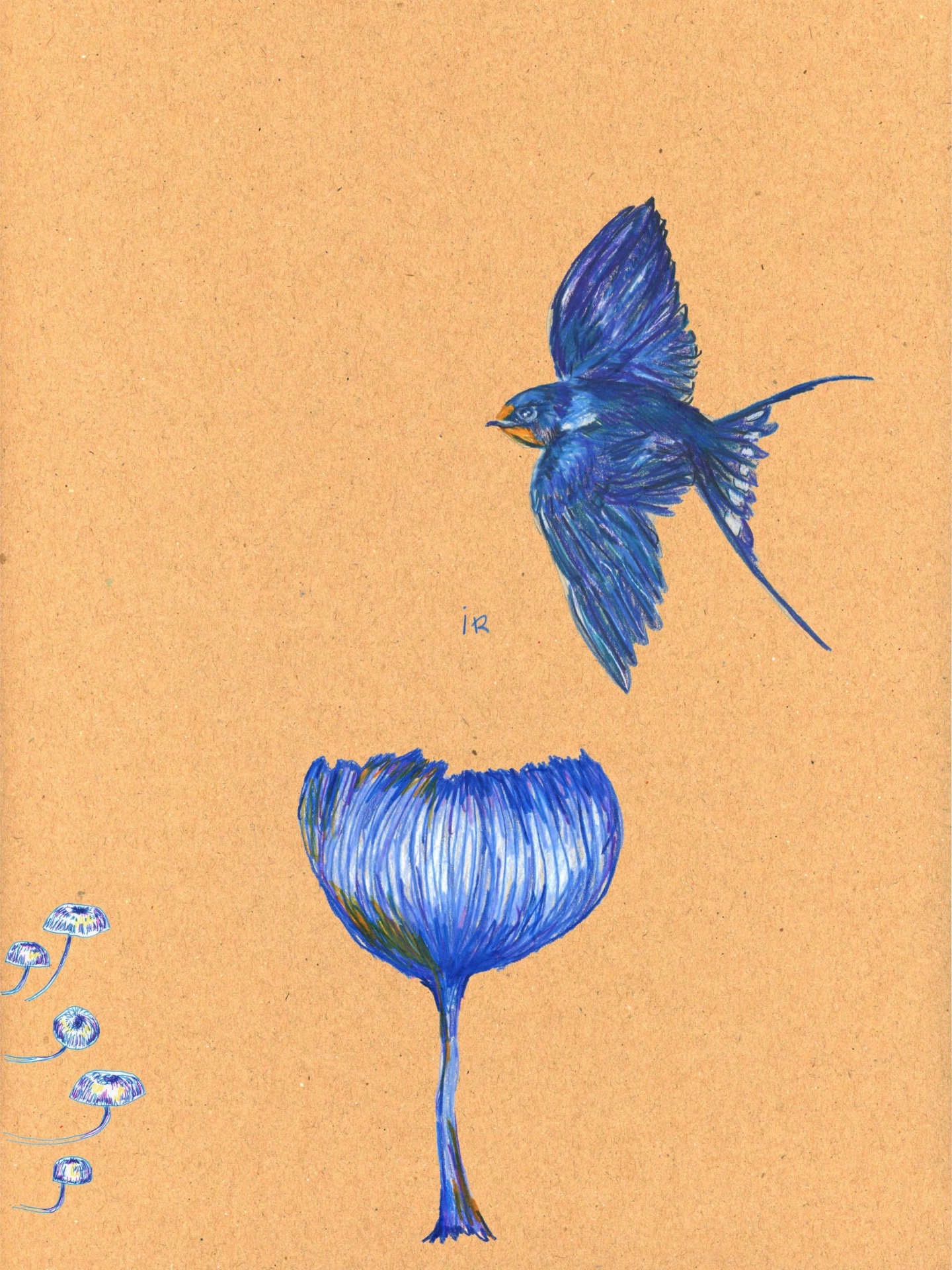 Desenho artístico de pássaro azul a voar, flor azul e cogumelos azuis em fundo castanho.