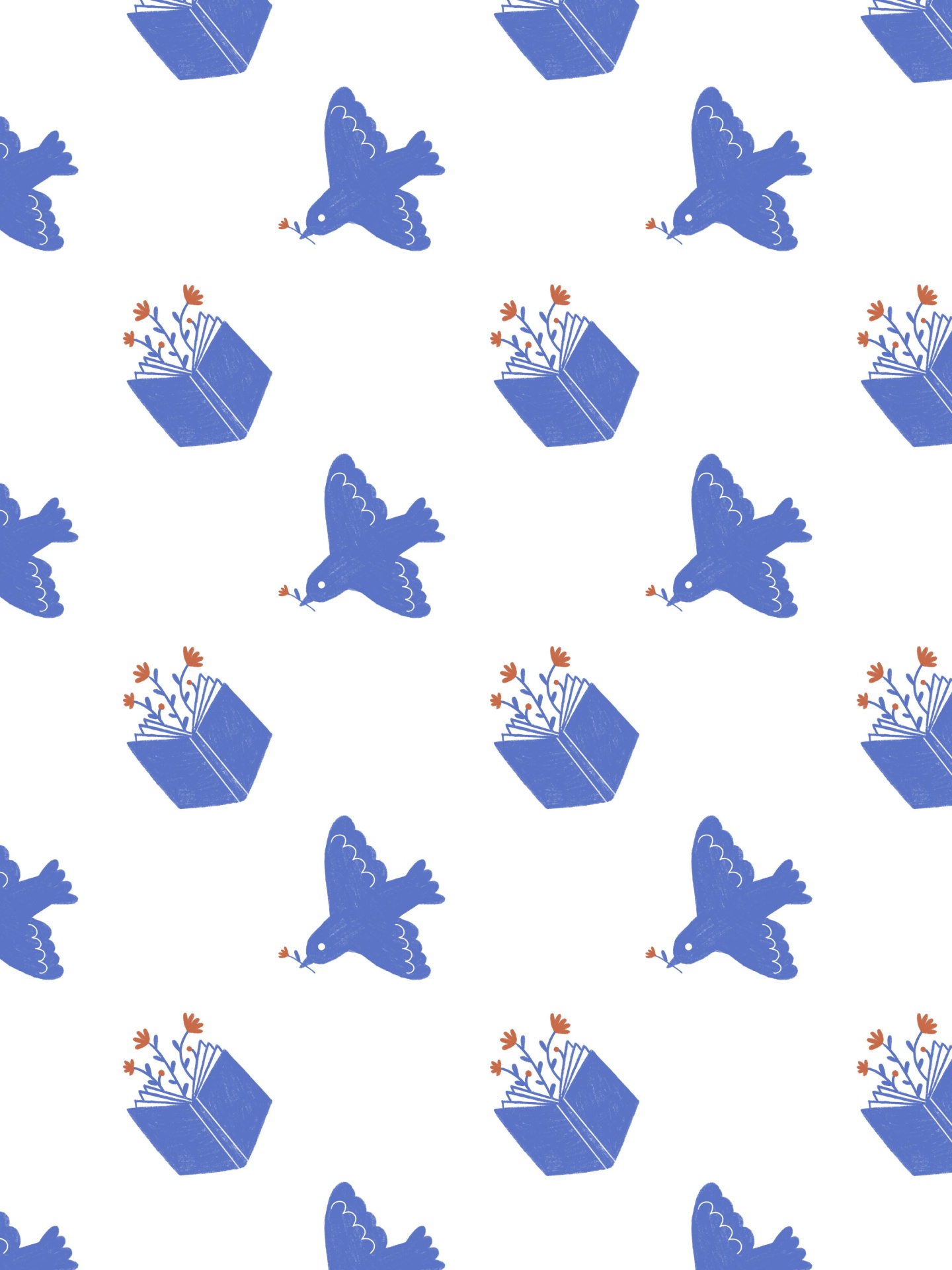 • Padrão com pombas azuis e vasos azuis com flores laranjas