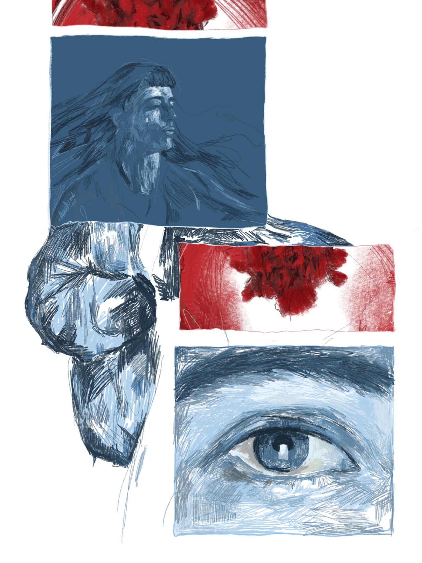 Ilustração artística com retrato, flores vermelhas e close-up de olho em azul e vermelho.