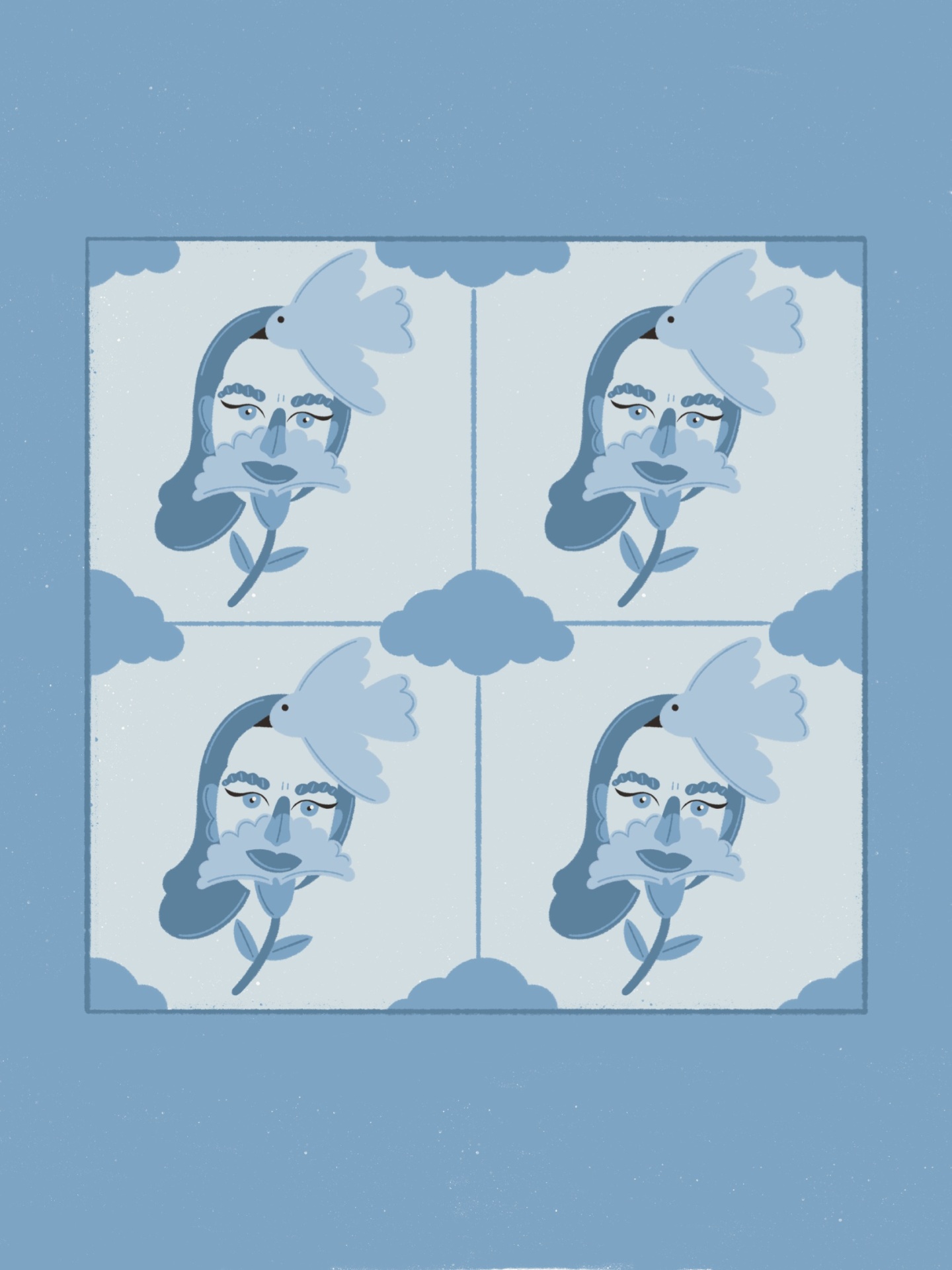• Padrão quadriculado azul com ilustração de rosto feminino, nuvens e ave branca.