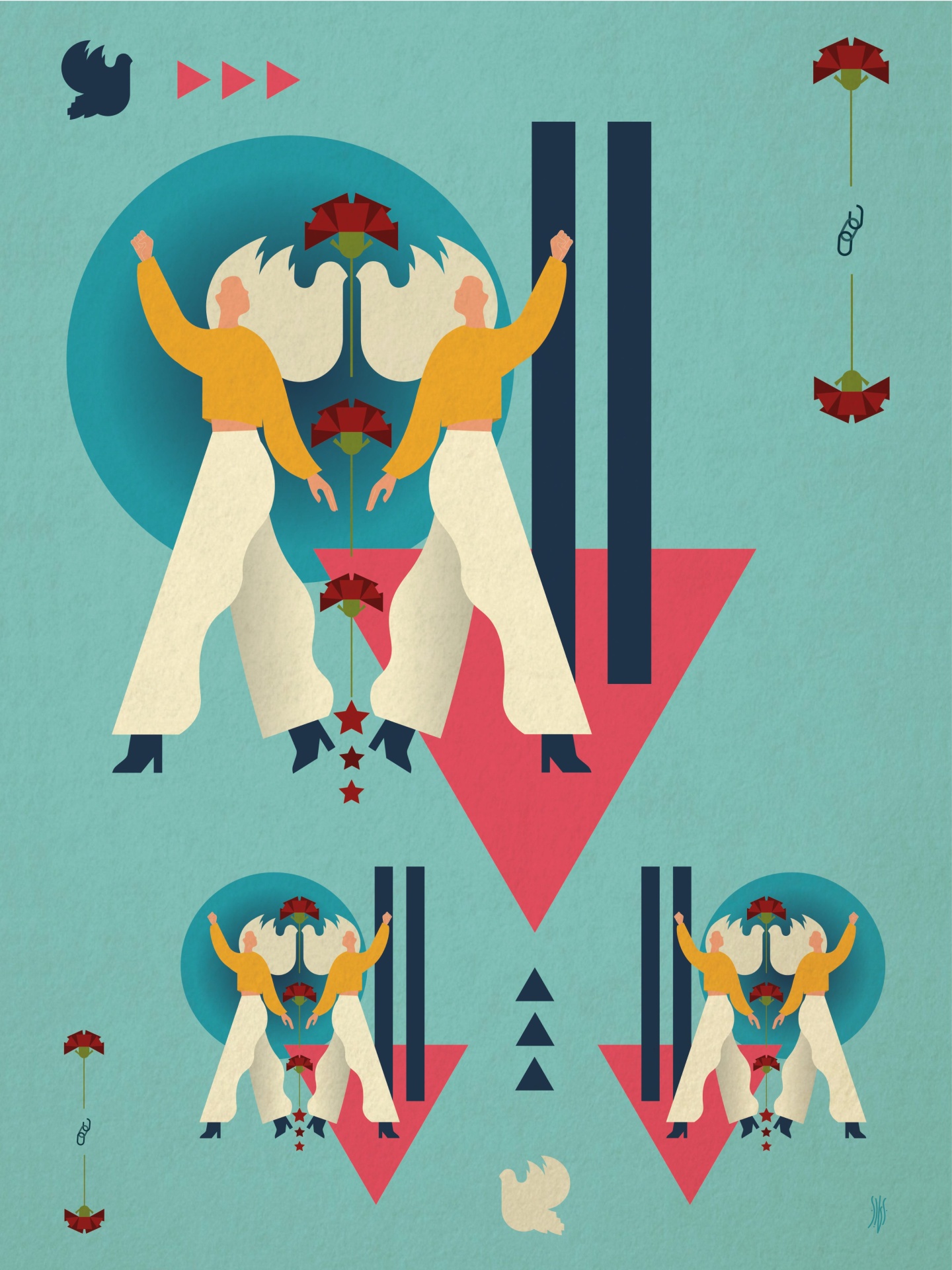 • Ilustração digital com figuras humanas amarelas e brancas segurando cravos vermelhos sobre fundo azul e vermelho com formas geométricas.