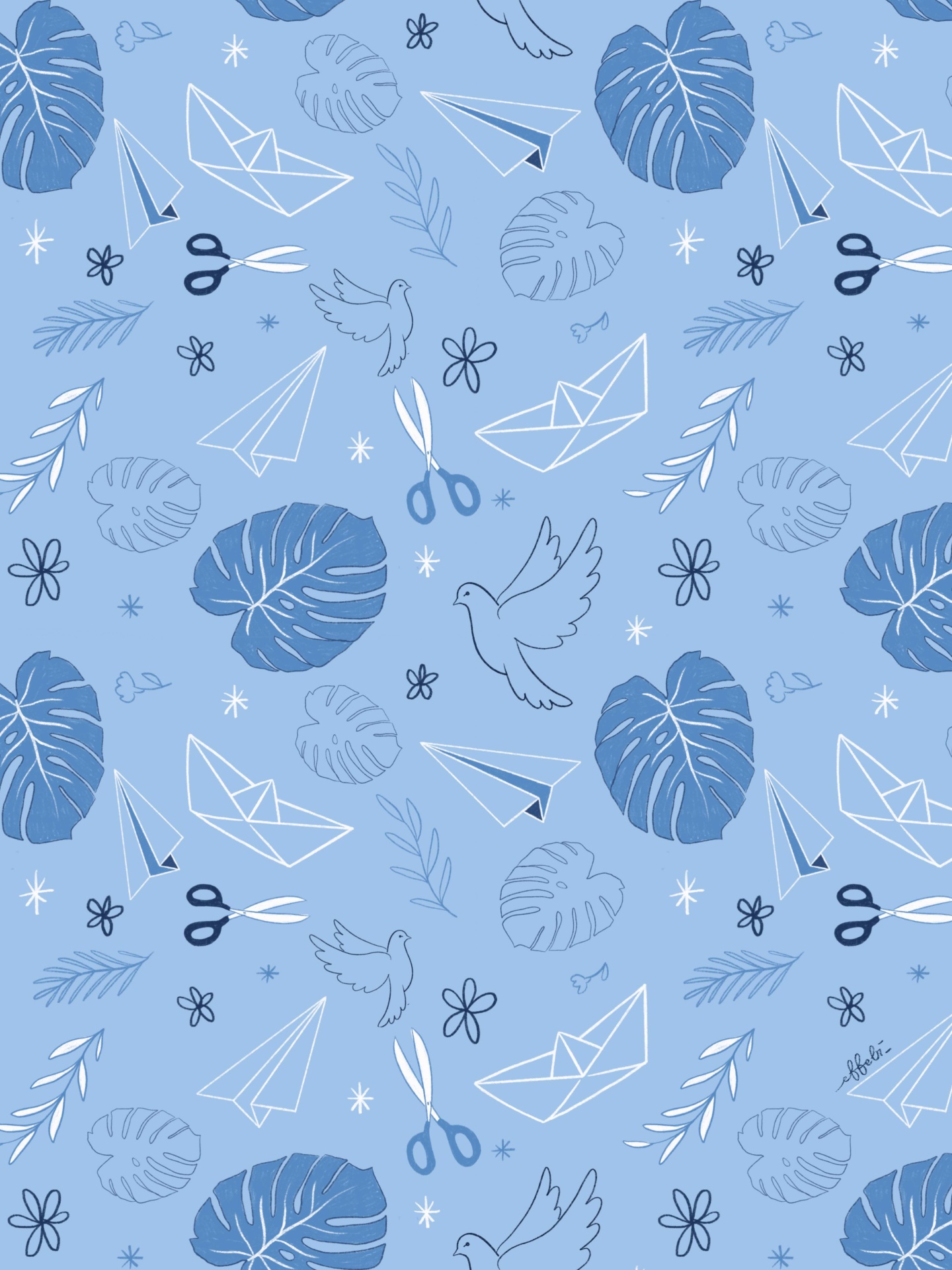 • Padrão azul com folhas tropicais, pássaros, tesouras e figuras de papel