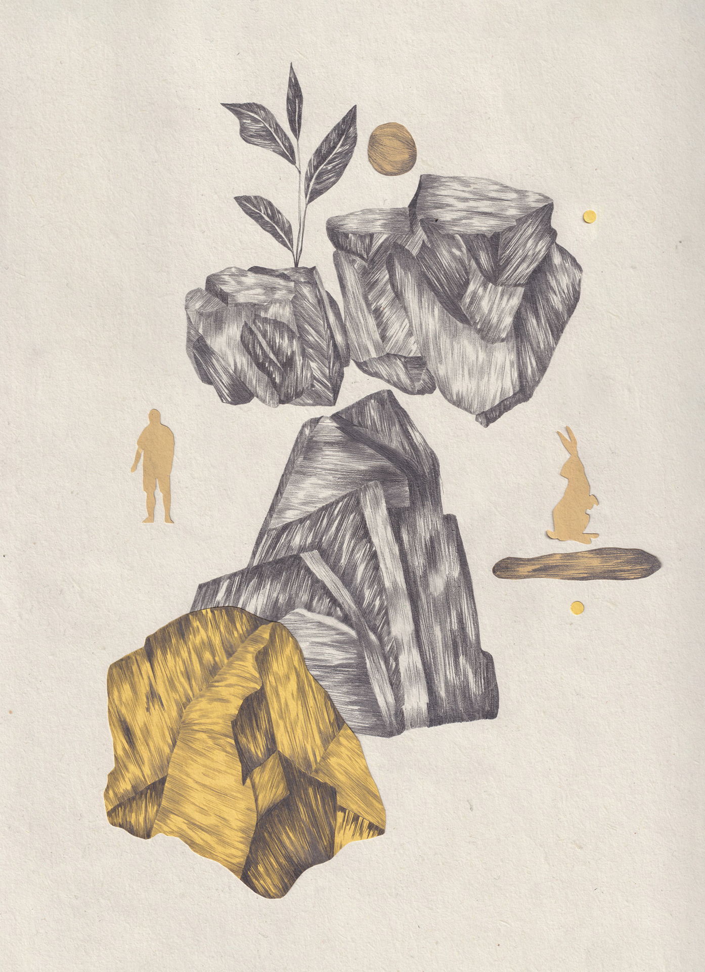 Desenho artístico com pedras cinza e amarelas, folhas e figuras douradas de pessoa e coelho em fundo branco