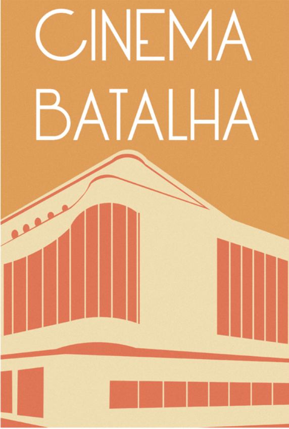• Ilustração gráfica do edifício Cinema Batalha com texto sobre fundo laranja