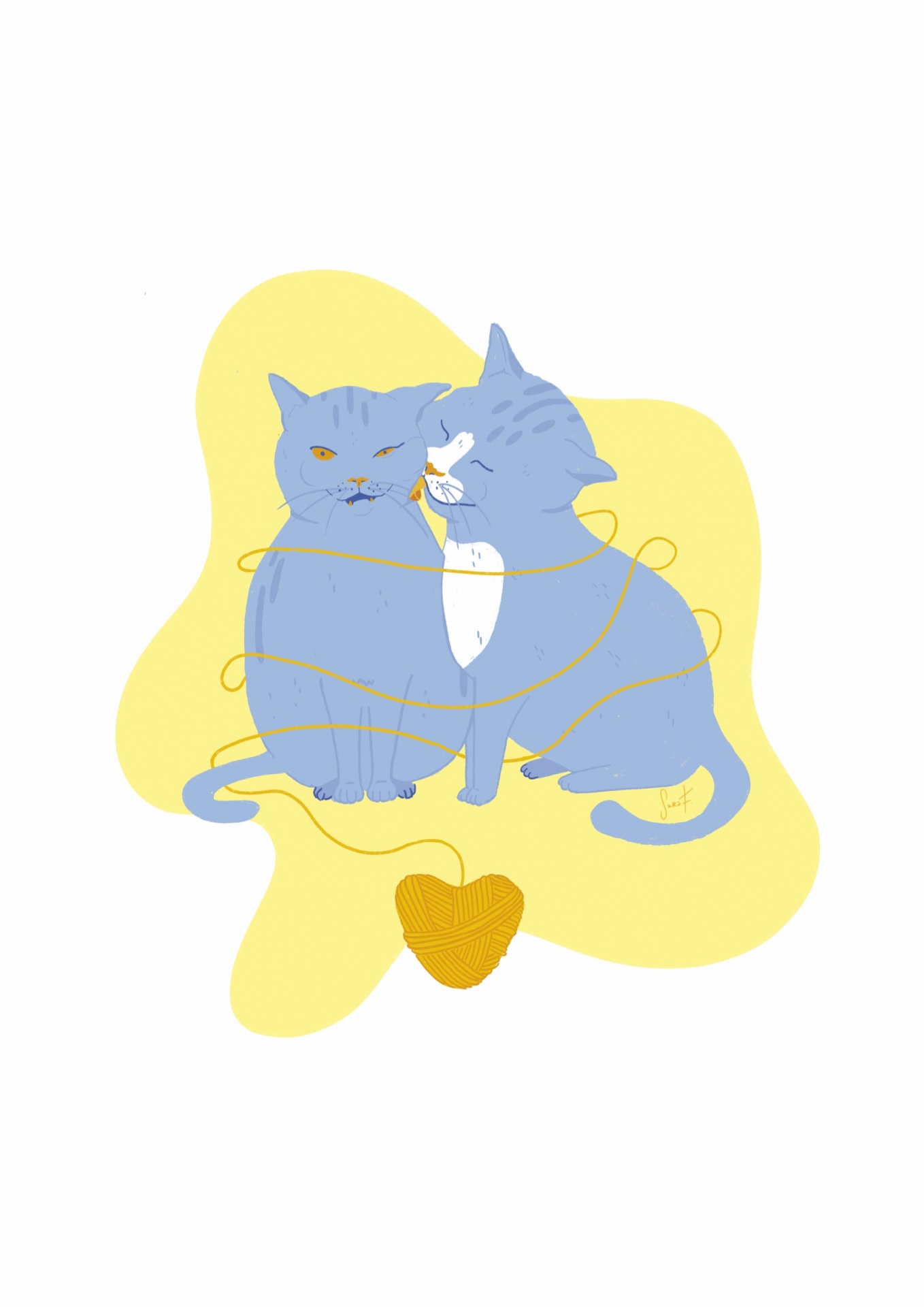 • Dois gatos azuis ligados por novelo de lã amarelo em formato de coração sobre fundo amarelo
