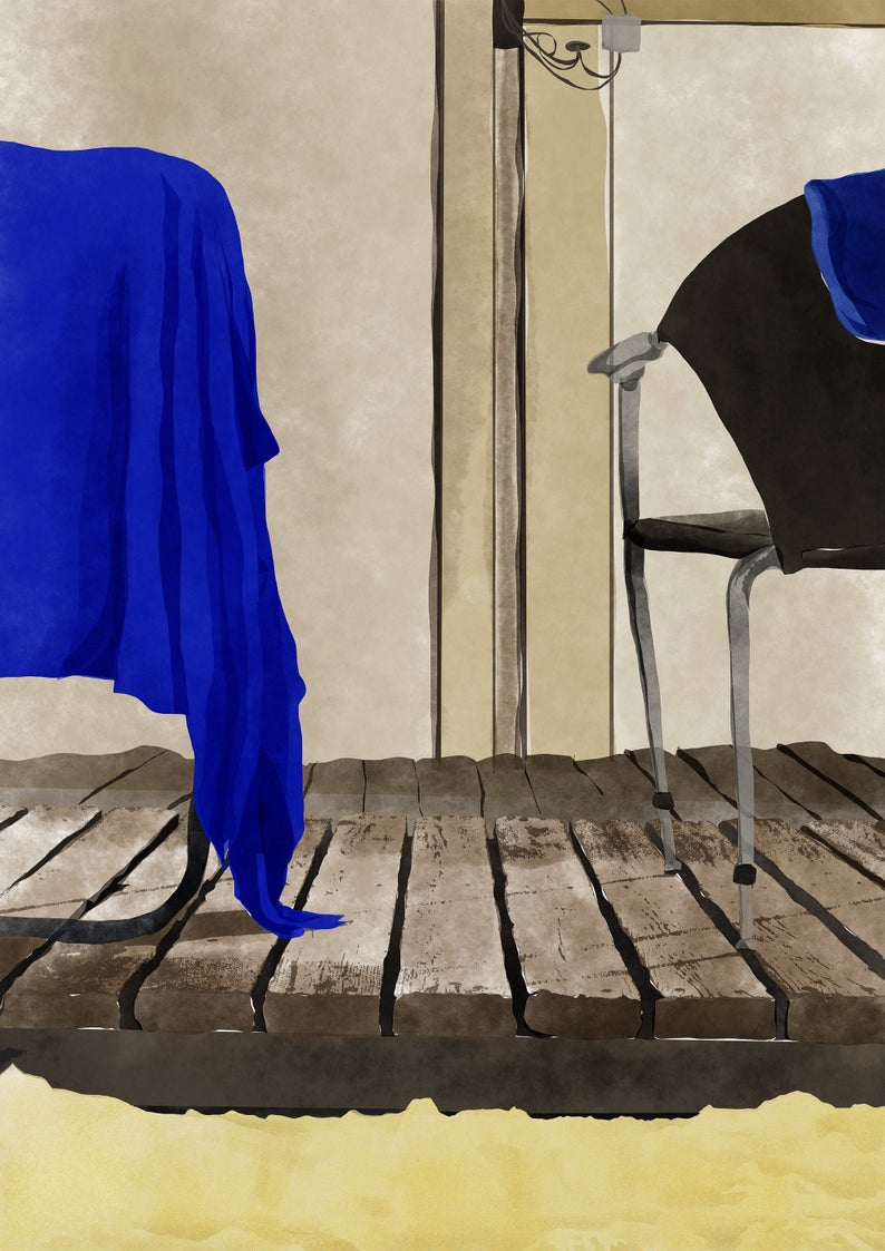 • Dois bancos metálicos com tecidos azuis sobre plataforma de madeira desgastada e fundo bege