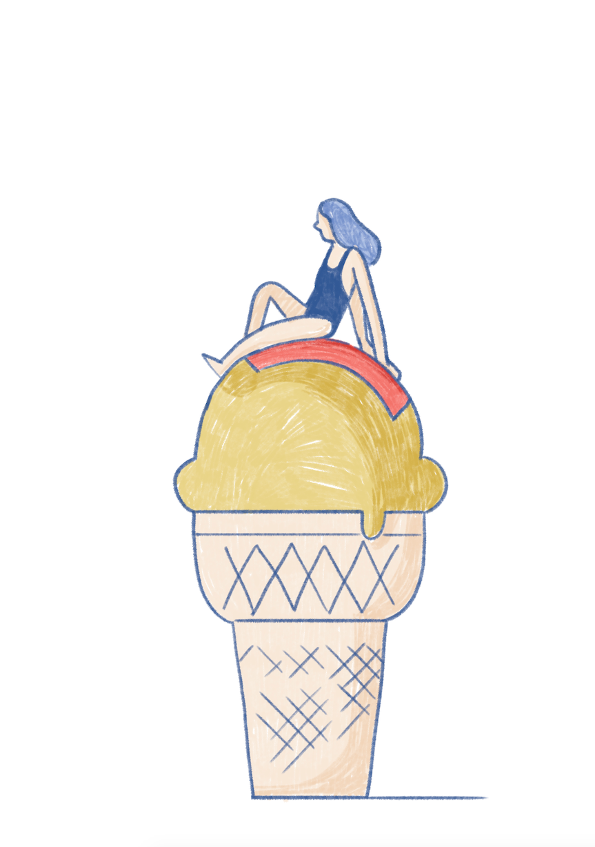• Ilustração mulher em fato de banho azul sentada em gelado em cone amarelo com fatia vermelha