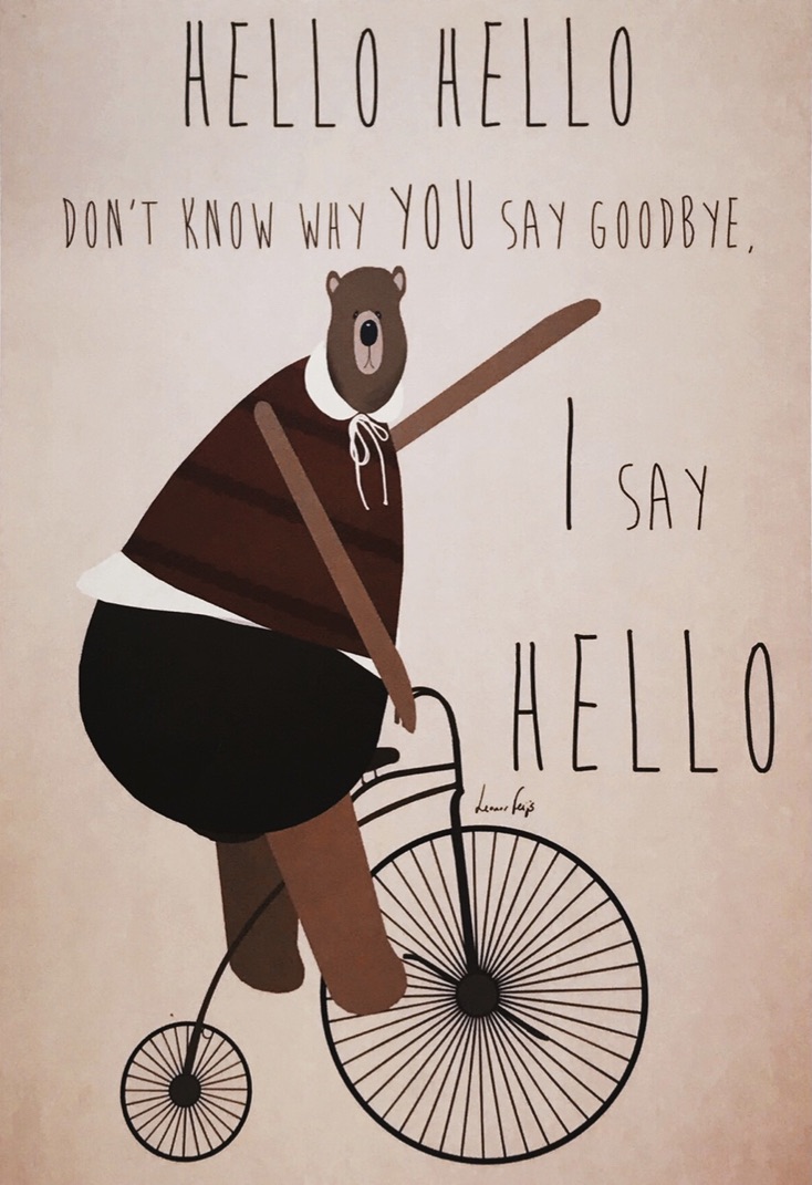 Ilustração de urso castanho em bicicleta antiga com texto em fundo bege