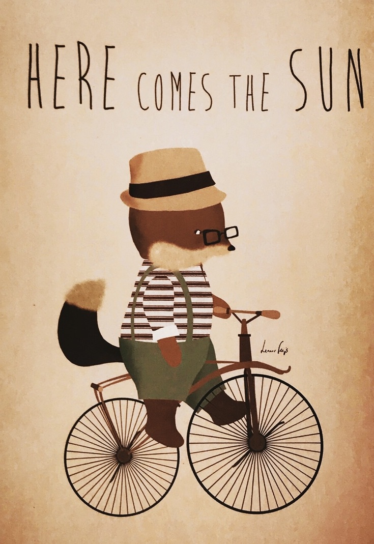 • Desenho de guaxinim com roupa vintage a andar de bicicleta com texto Here Comes The Sun