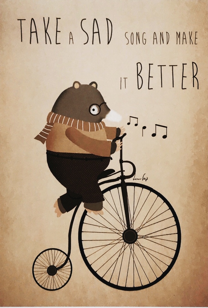 Ilustração de urso com bicicleta vintage e texto motivacional