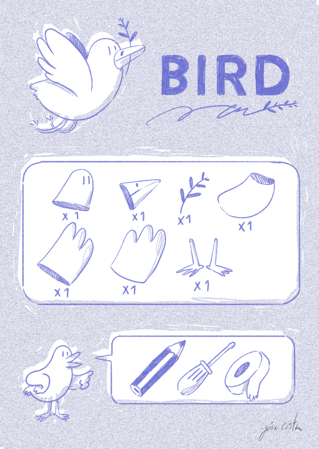 Como se desenha um pássaro? 1 - Começa com um círculo para a cabeça e um oval para o corpo. 2 - Em seguida as formas das asas e da cauda. 3 - Desenha os detalhes do rosto, como os olhos, as narinas e a crista. 4 - Desenha as penas nas asas e na cauda.