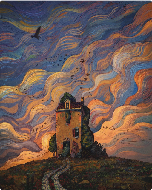 • Casa isolada com céu de nuvens ondulantes coloridas e pássaros a voar