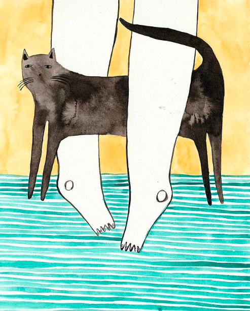 • Ilustração de pernas humanas com gato preto esticado entre elas, fundo amarelo e riscas verdes no chão