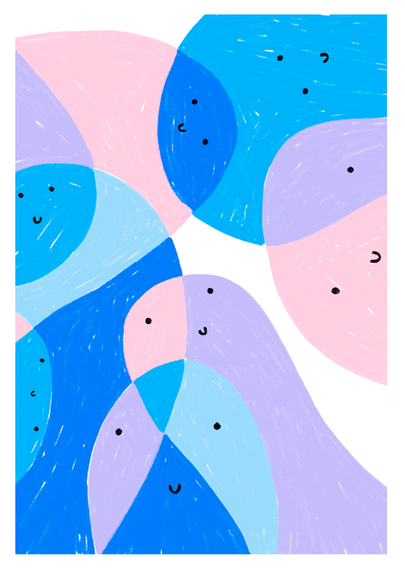 Ilustração abstrata com formas coloridas e rostos minimalistas