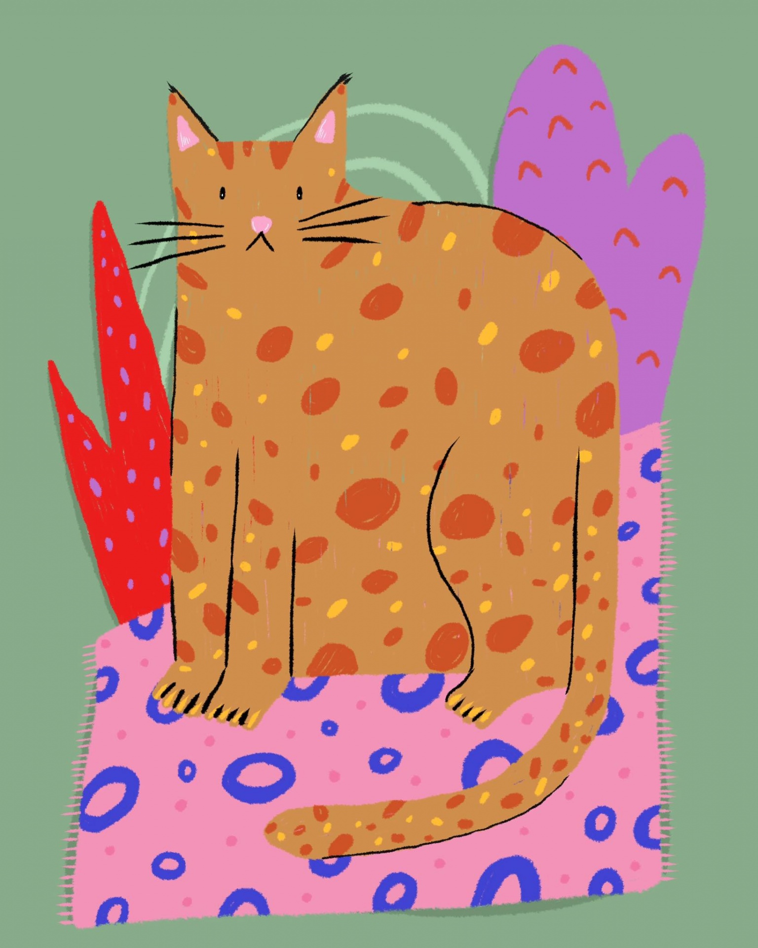 • Ilustração de gato laranja com manchas sobre tapete rosa com padrões azuis