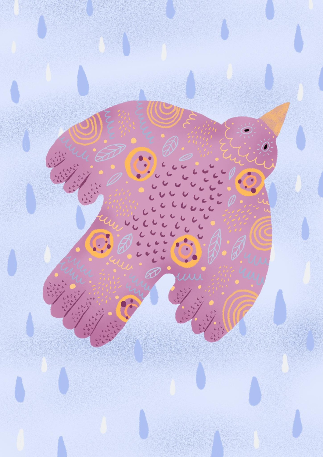 Ilustração de pássaro rosa com padrão circular em fundo azul com gotas