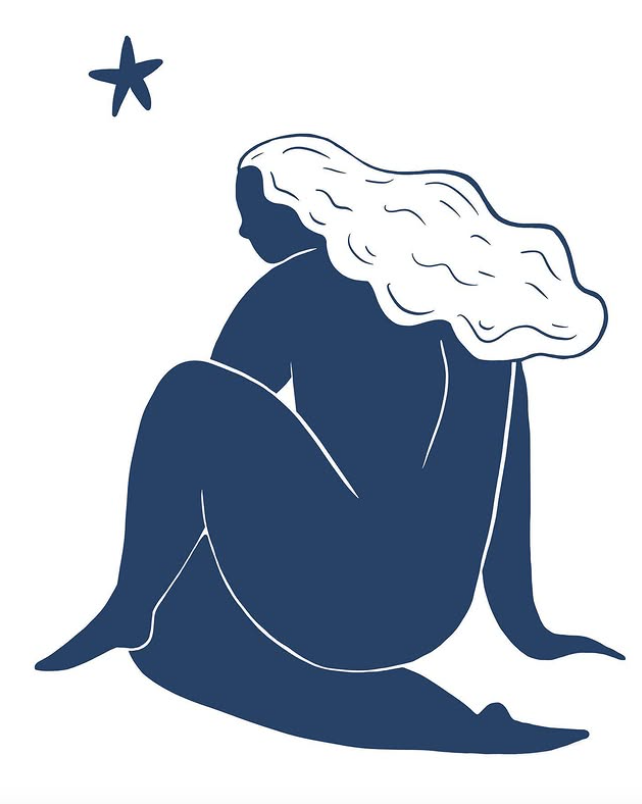 • Ilustração estilizada de figura humana sentada de costas com cabelo branco e estrela azul