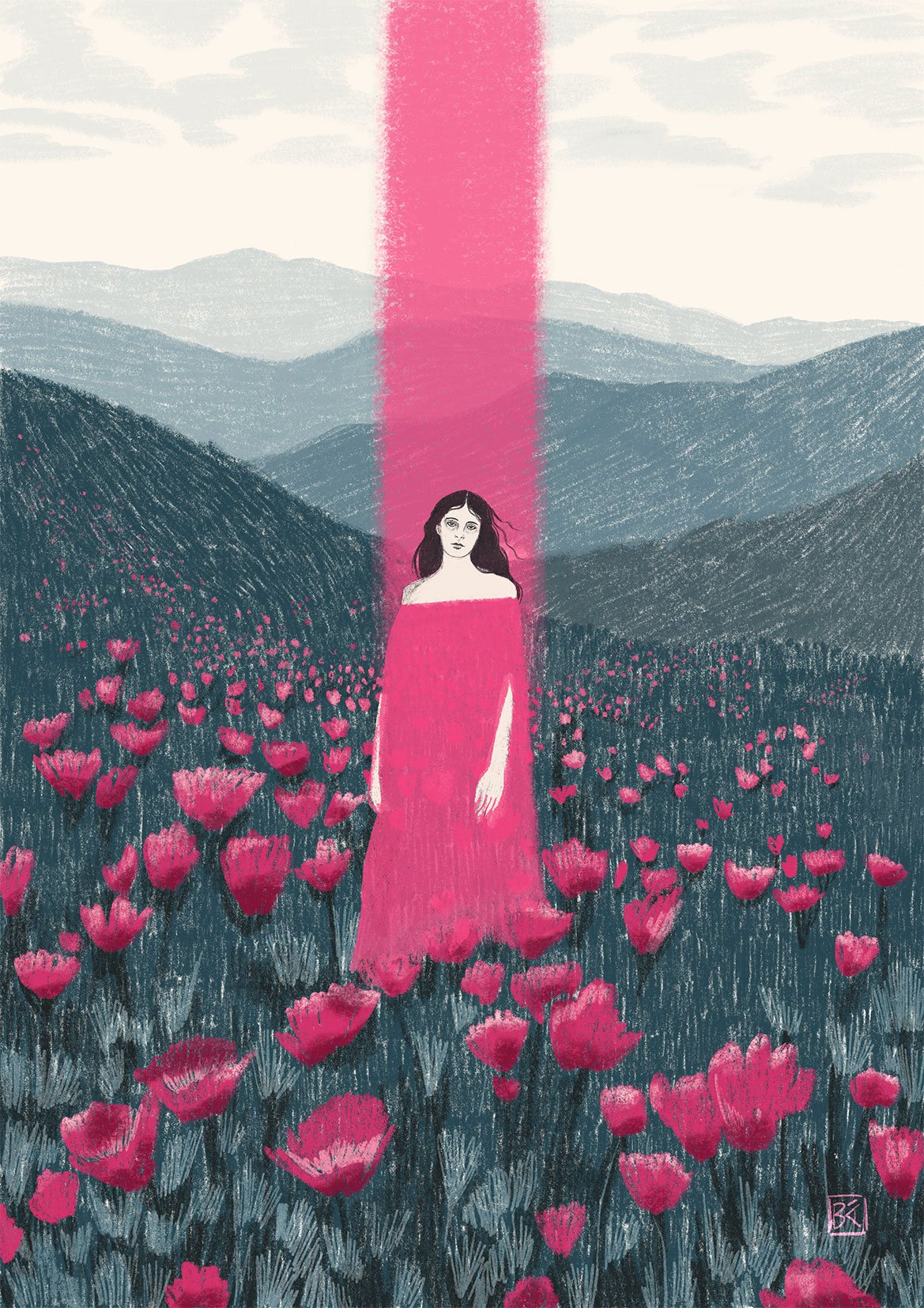 • Mulher com vestido rosa num campo de flores rosa e montanhas azuis ao fundo