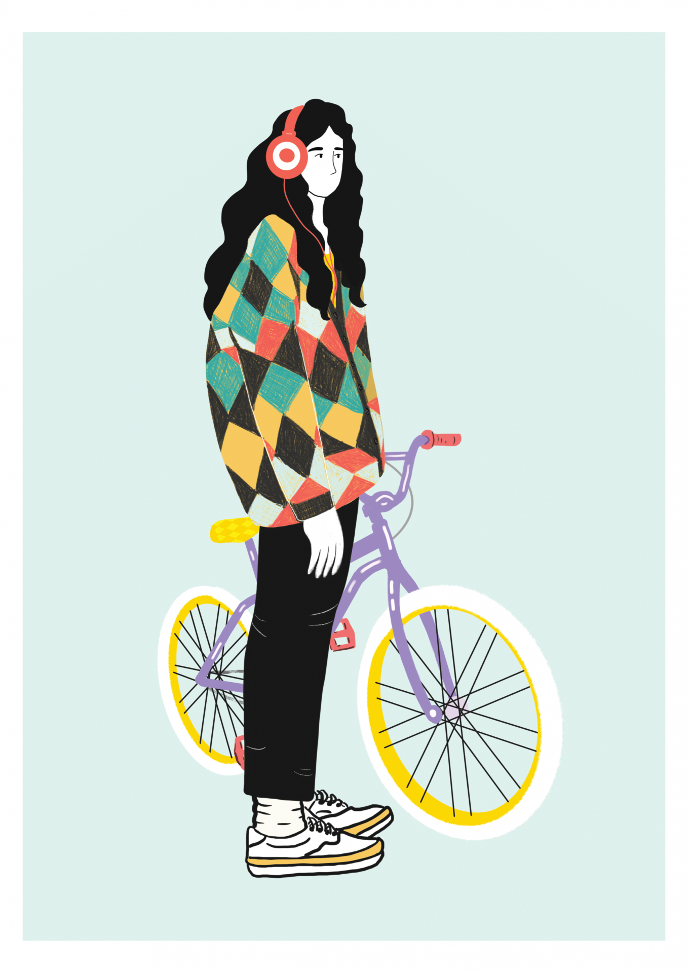 • Pessoa com camisola colorida e auscultadores vermelhos ao lado de bicicleta roxa com pneus amarelos e brancos