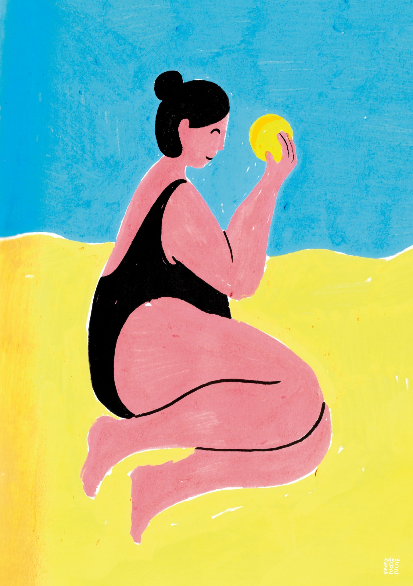 Ilustração de mulher com maiô preto segurando bola amarela na areia.