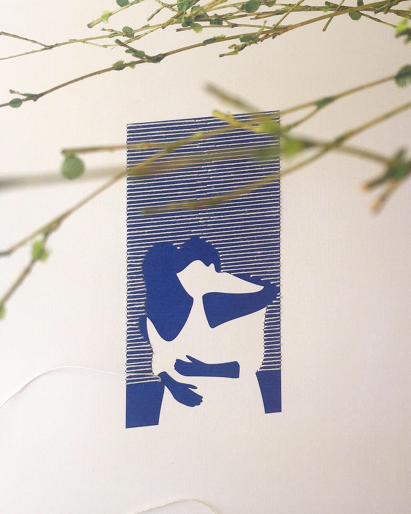• Recorte em papel de silhueta de duas pessoas a abraçar em padrão azul e branco na parede