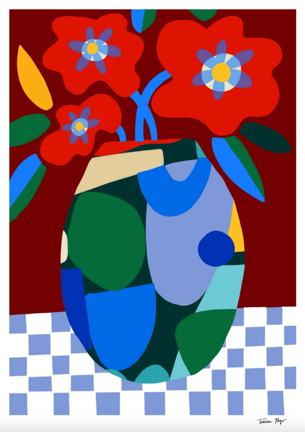 • Vaso colorido com flores vermelhas em imagem digital estilizada sobre fundo vermelho e superfície xadrez azul e branca.