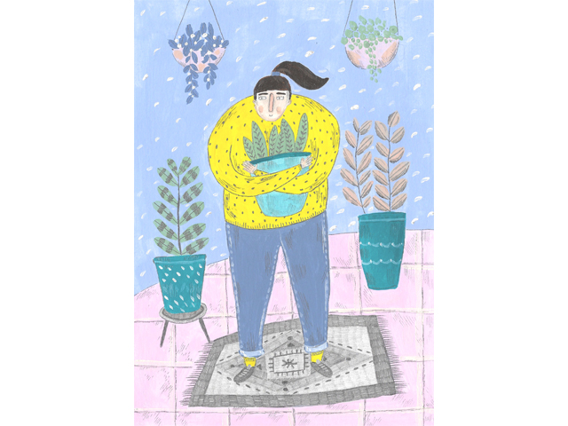 • Desenho de pessoa segurando vaso com planta em ambiente com outras plantas e tapete