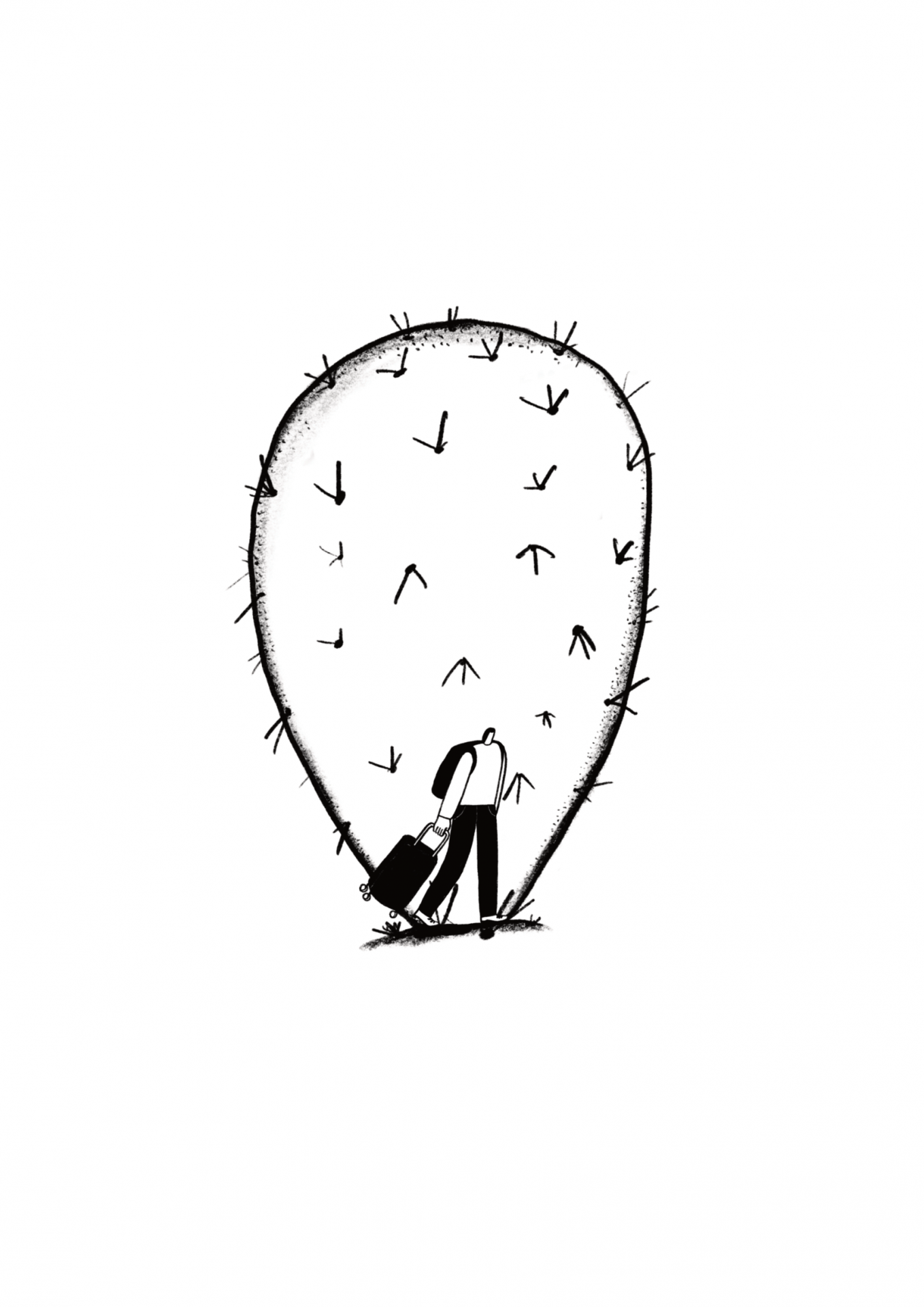 Desenho em preto e branco de pessoa com mala junto a forma com espinhos