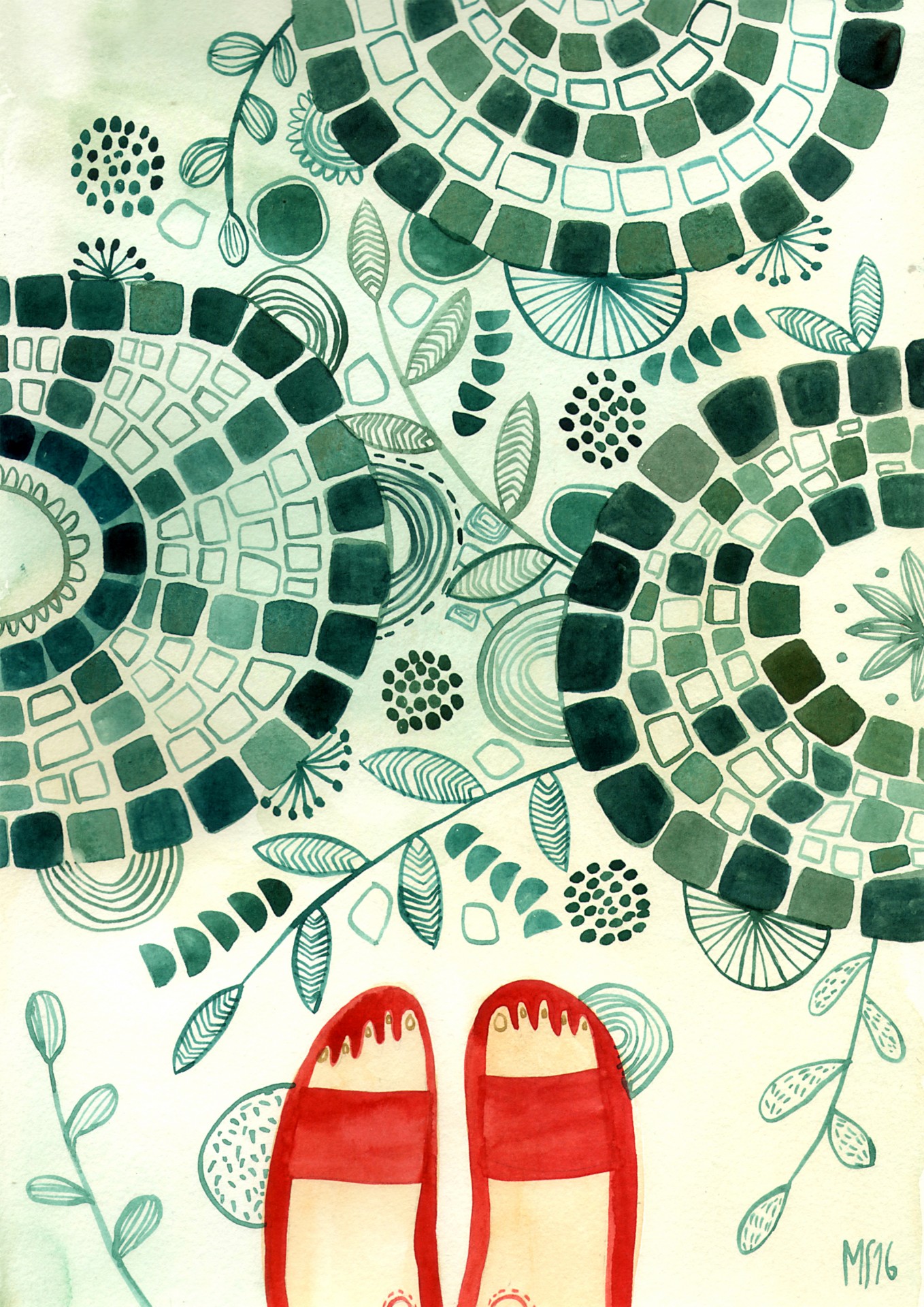 • Desenho com padrões circulares verdes e pés com sandálias vermelhas num fundo branco com desenhos florais.