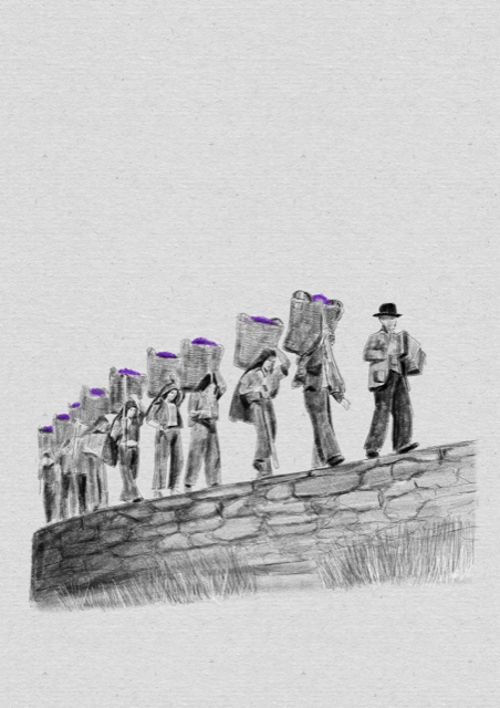 • Desenho a preto e branco de pessoas carregando cestos com detalhe lilás numa parede de pedra