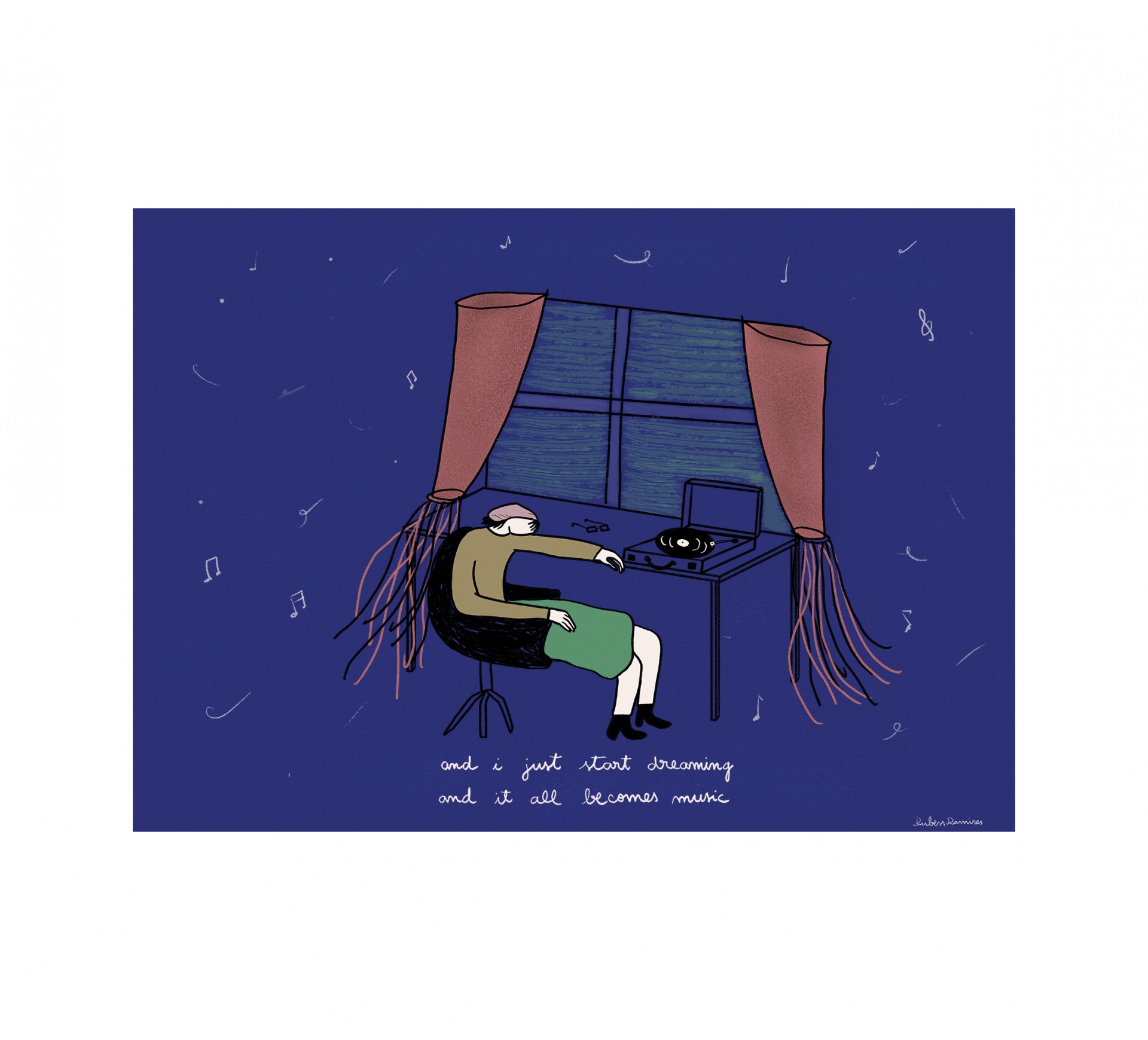 Desenho de pessoa a tocar música junto a uma janela com cortinas castanhas.