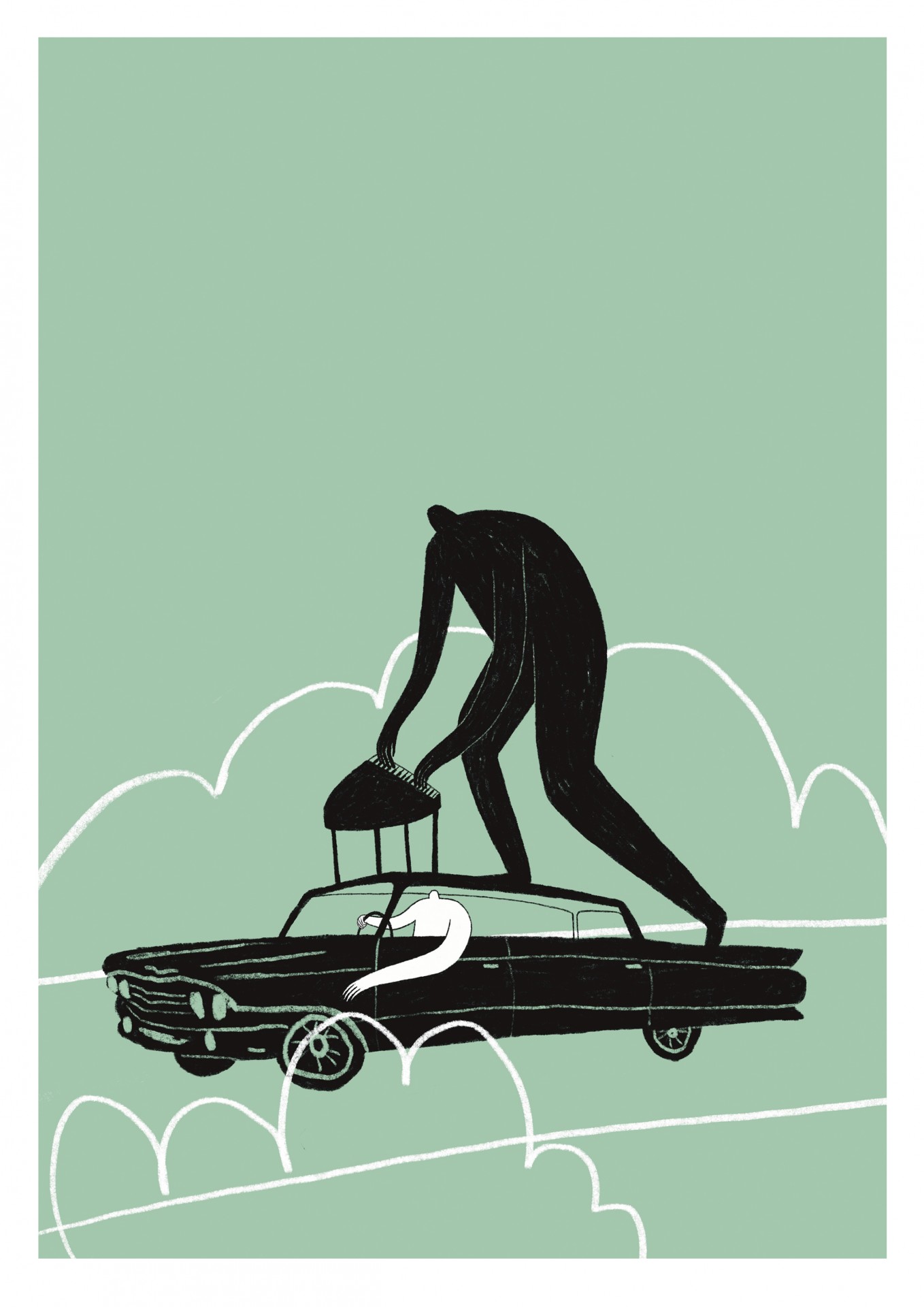 • Ilustração de figura humana negra gigante a segurar carro clássico preto em fundo verde com nuvens brancas