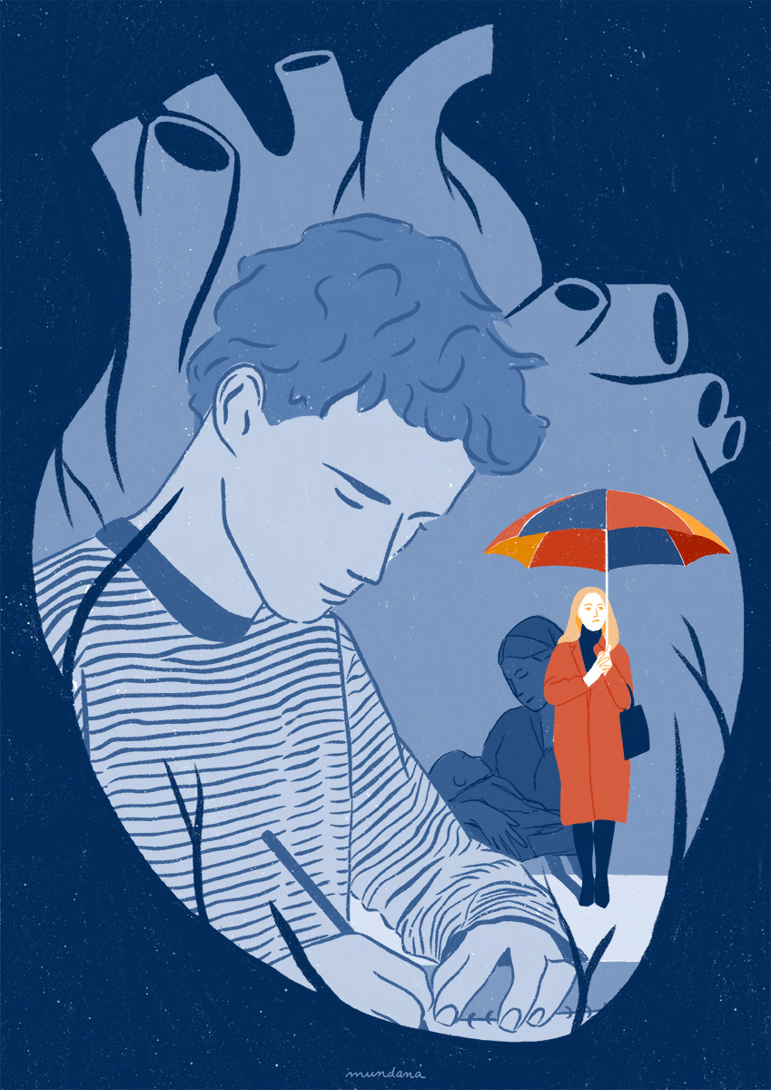 • Ilustração de um coração com um rapaz a escrever e uma mulher de guarda-chuva laranja e vermelho
