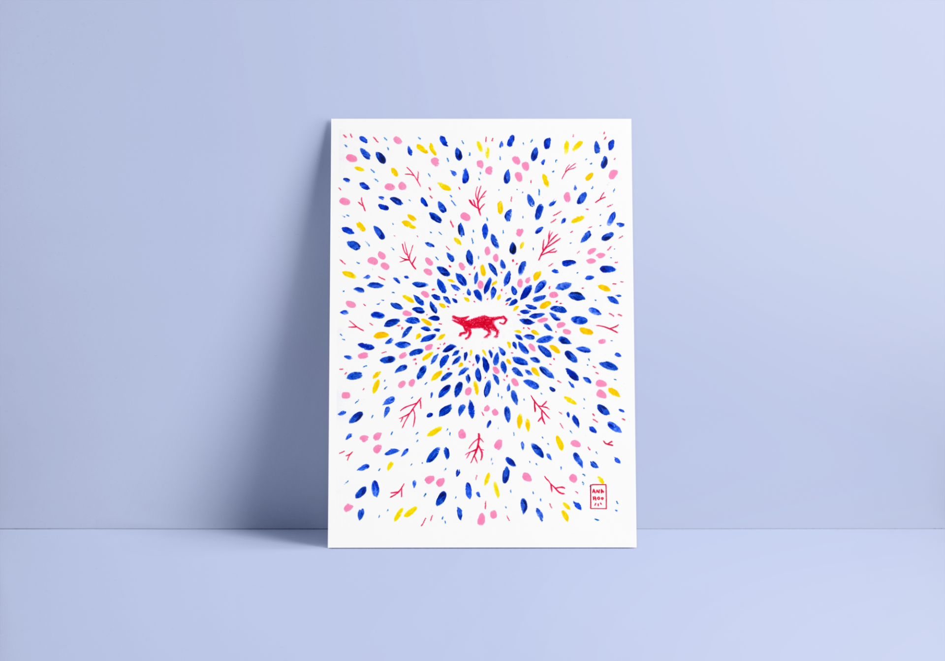 • cartaz decorativo com padrão colorido e figura de raposa vermelha