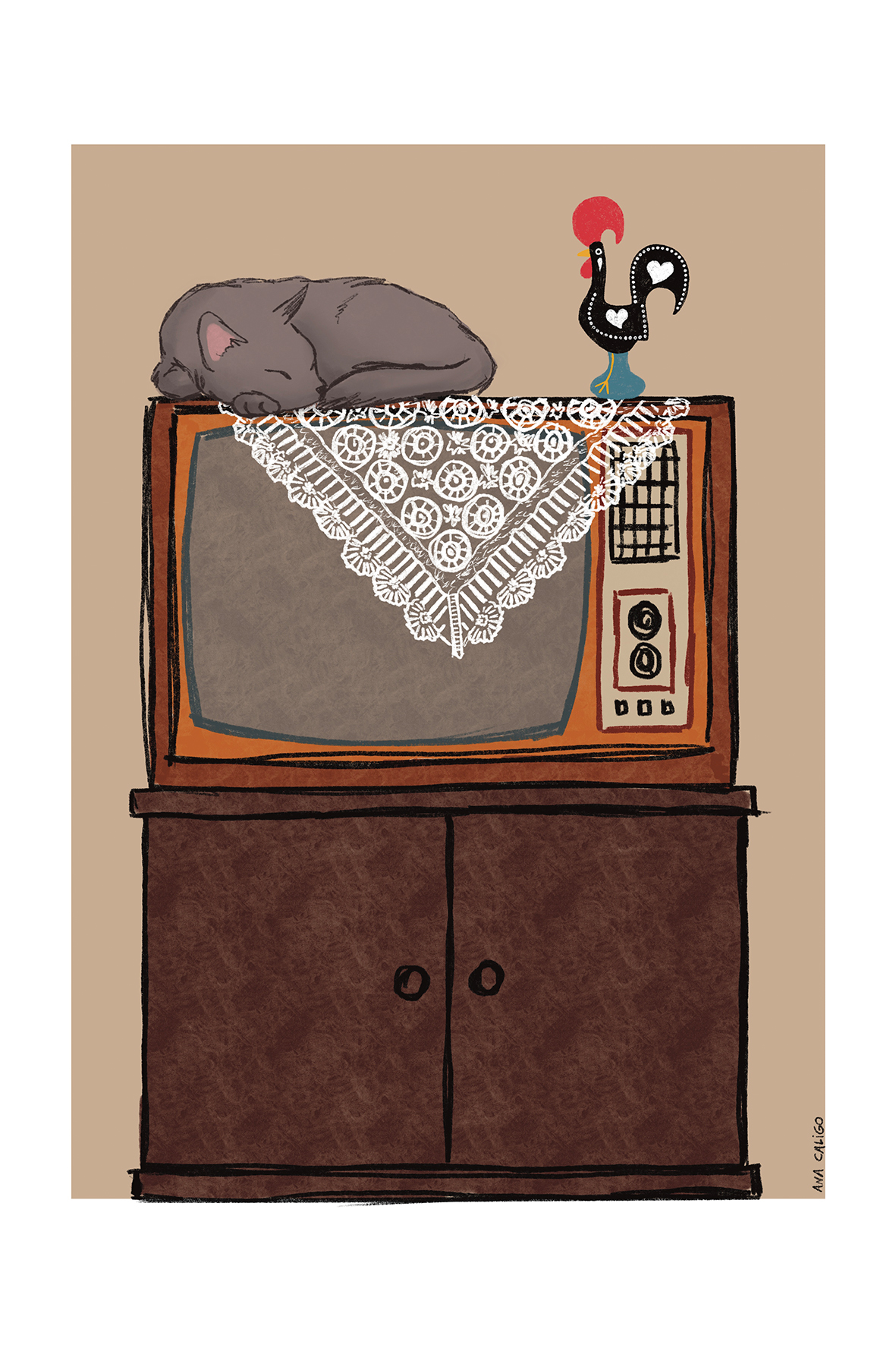 desenho de televisão antiga com gato em cima e galo decorativo