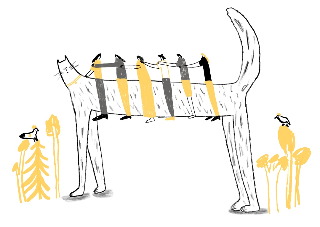 • Desenho estilizado de gato com pássaros e plantas amarelas