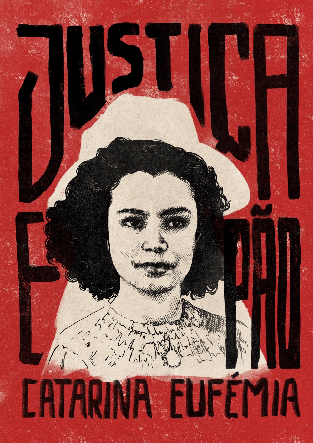 • Cartaz vermelho com texto preto e retrato desenhado de Catarina Eufémia