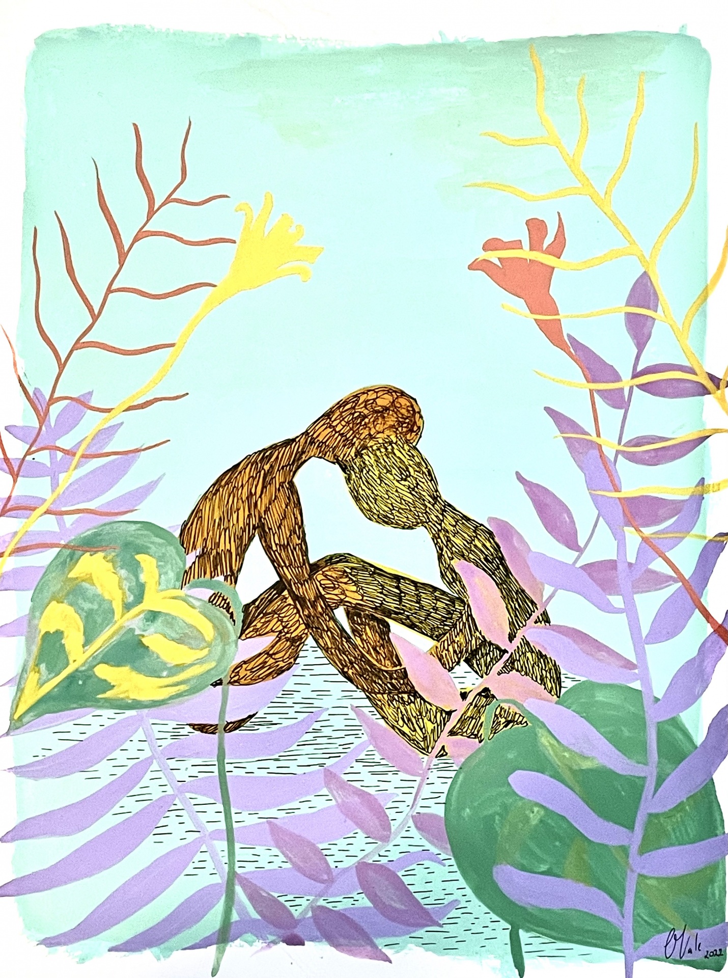 Pintura abstrata de duas figuras humanas castanhas entre plantas coloridas em fundo azul claro