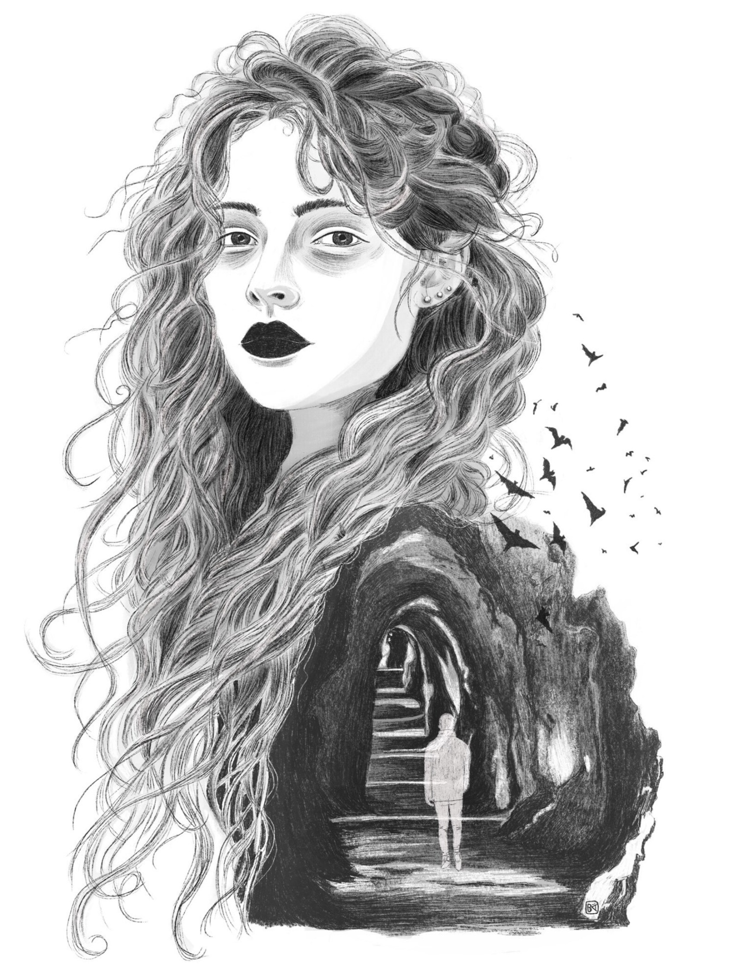 • Desenho de jovem com cabelo ondulado e transformação artística em caverna com escadas e aves.