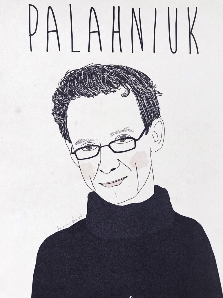 Desenho a preto e branco de um homem com gola alta e óculos com texto 'Palahniuk' em fundo branco